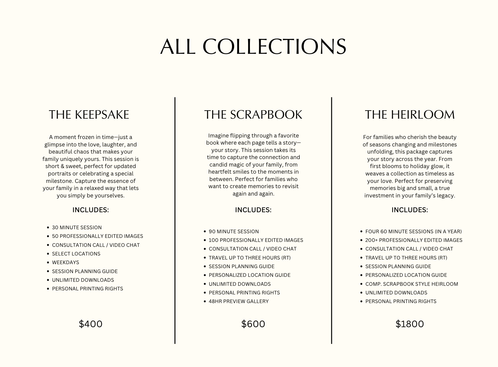 Two hours of session coverage | Professionally edited images minimum 200 | Individual & group shots | Travel (2hr distance round trip) | Personal location scouting | Outfit & Styling help | Online gallery with unlimited downloads | Full printing rights